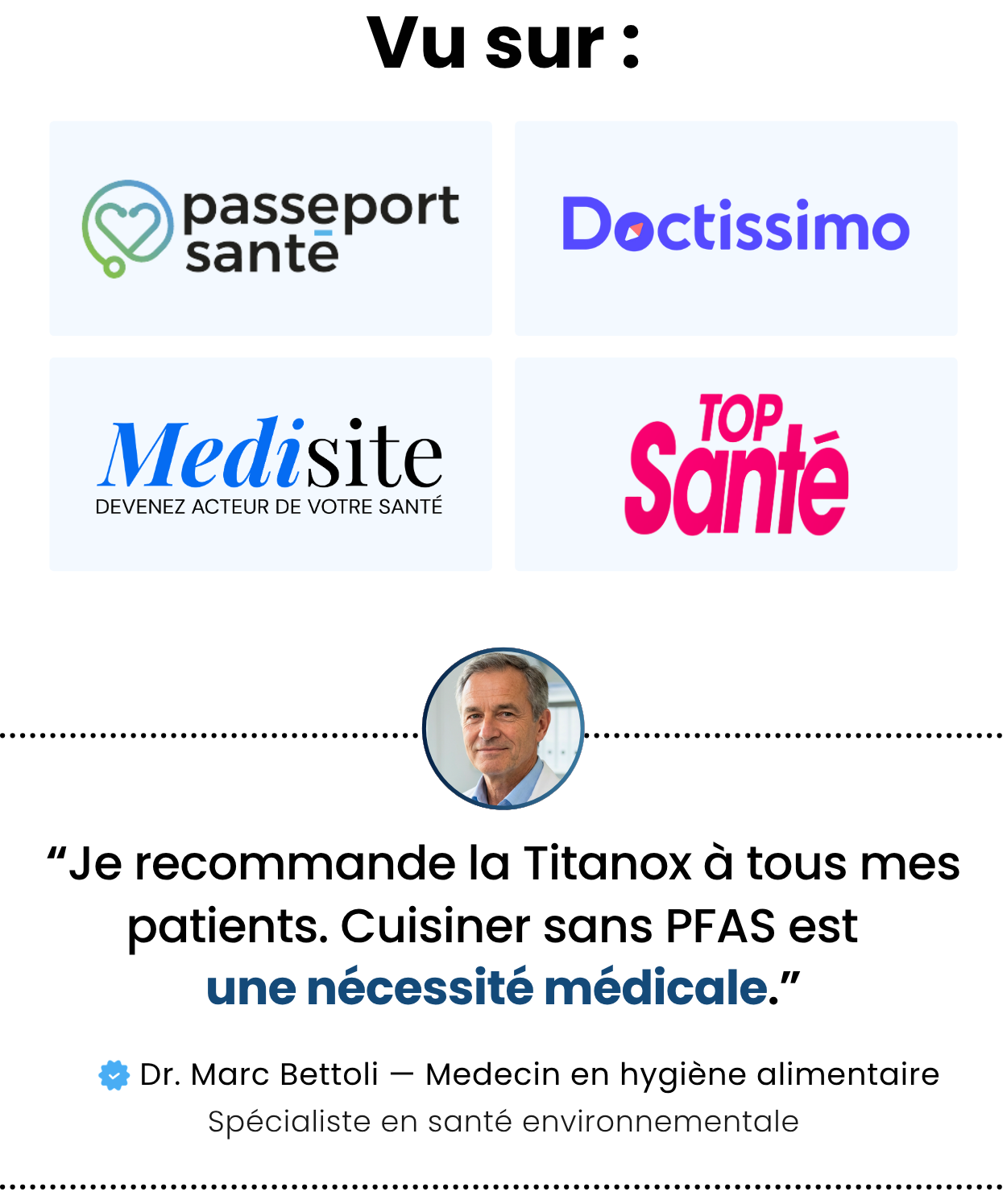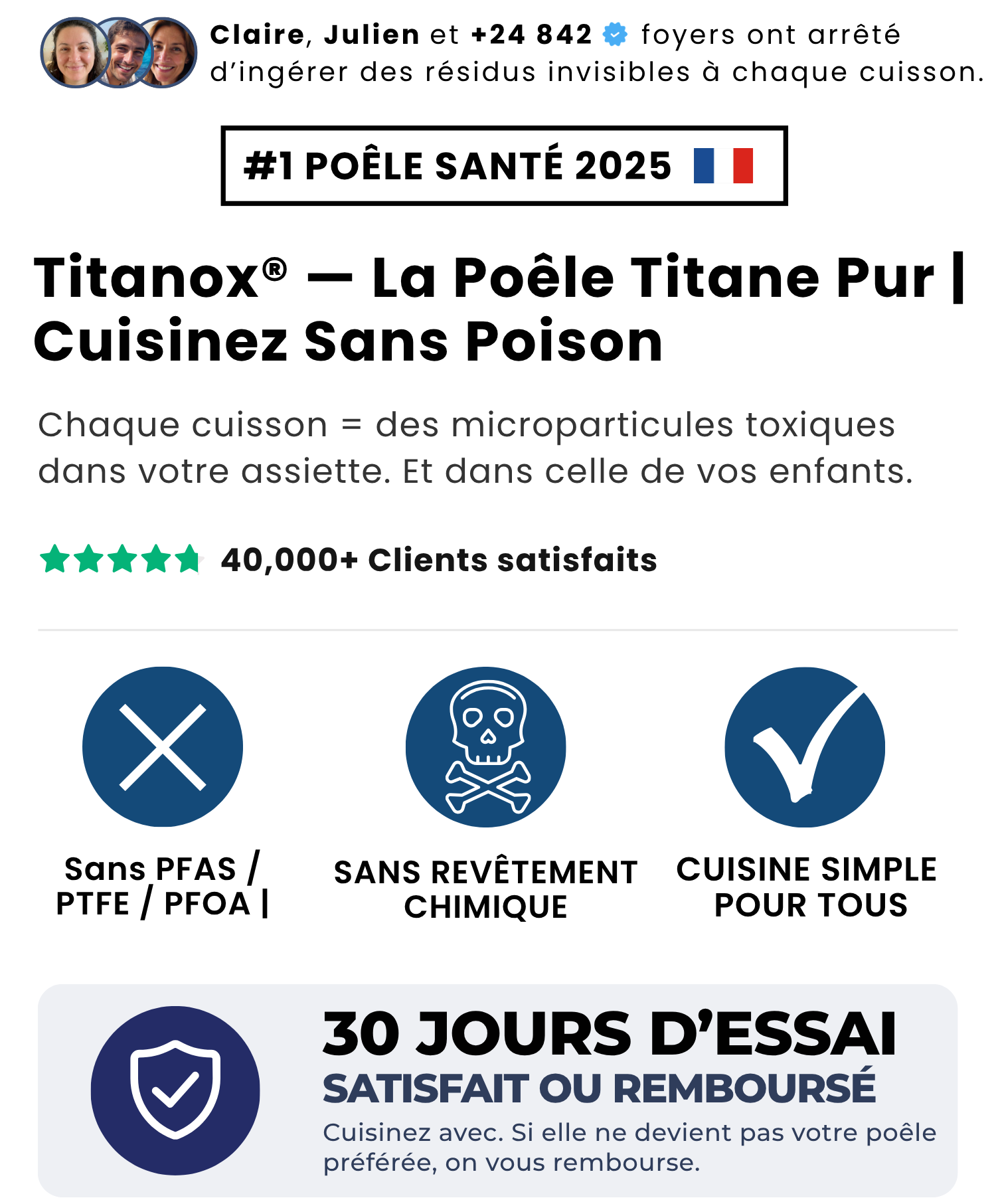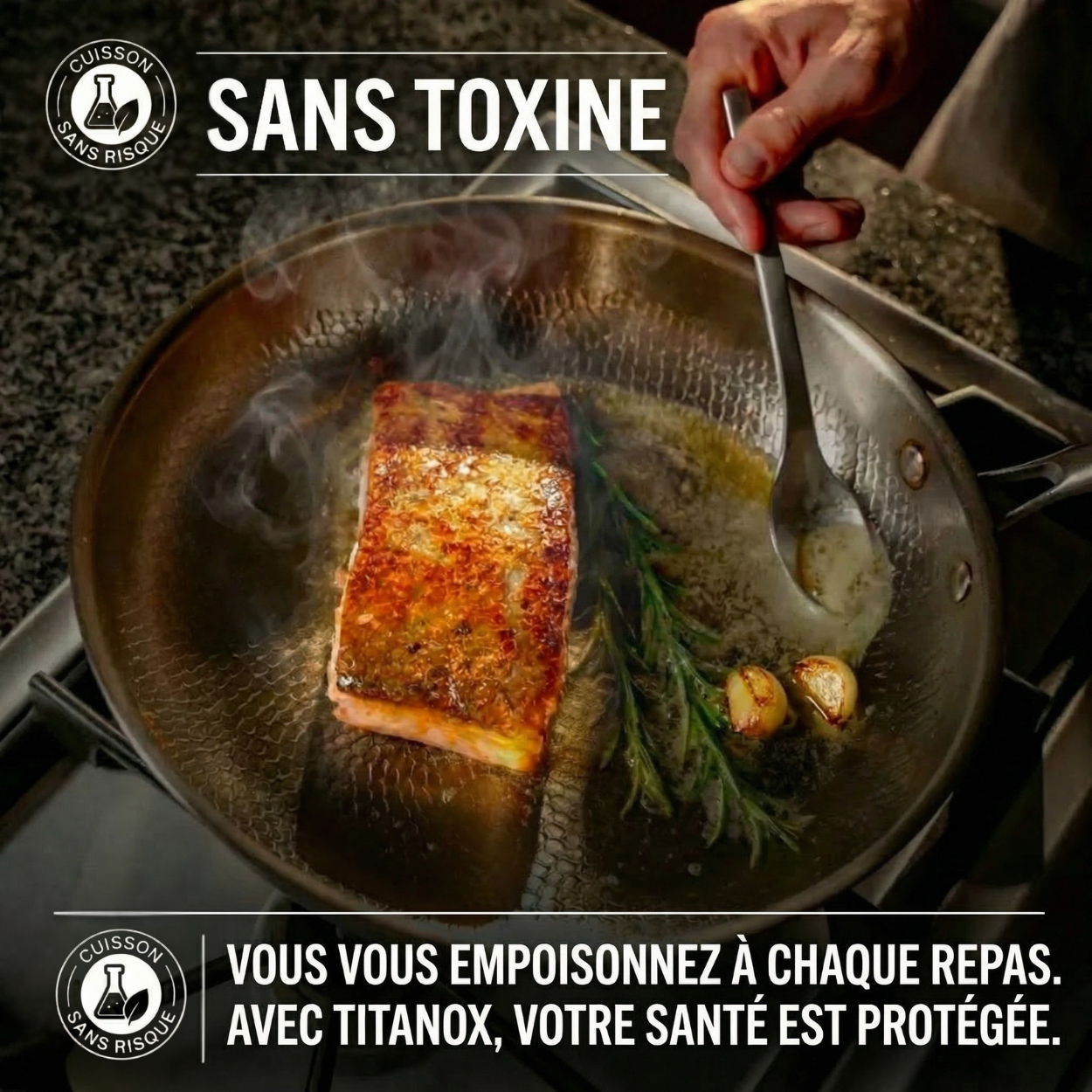 Parce que votre poêle antiadhésive vous empoisonne. Les revêtements PTFE et PFOA se dégradent à la chaleur et libèrent des microparticules toxiques directement dans vos plats. Vous les mangez. Chaque jour. Le titane pur, lui, ne contient aucun revêtement, aucune chimie, aucun risque. C'est le métal le plus sûr au monde — utilisé même en implants médicaux.