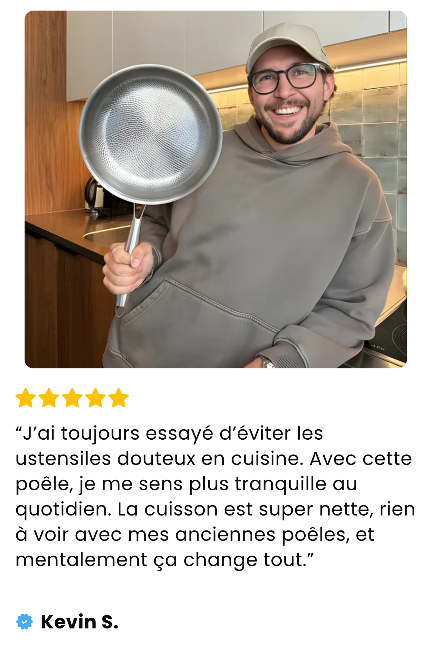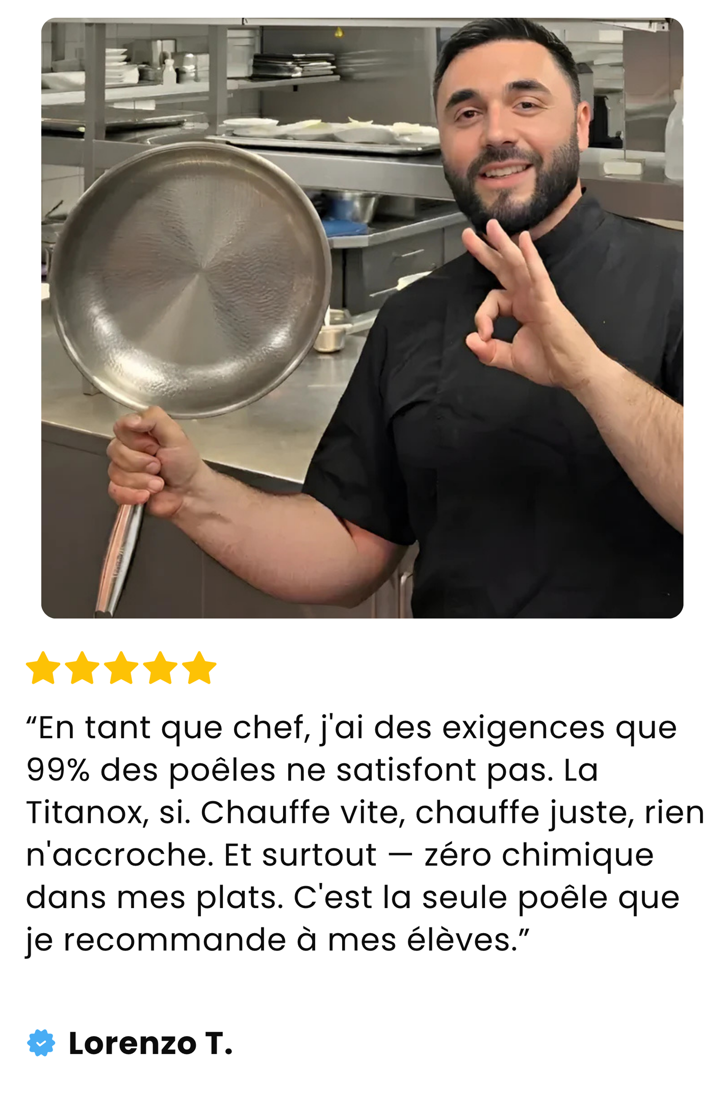 Non. C'est là toute la différence du titane 100% pur. Contrairement aux poêles en inox classiques, la Titanox n'exige aucun geste particulier, aucun préchauffage spécial, aucune technique. Vous cuisinez normalement — rien n'accroche. La surface martelée en titane pur est naturellement anti-adhérente, sans aucun revêtement chimique.